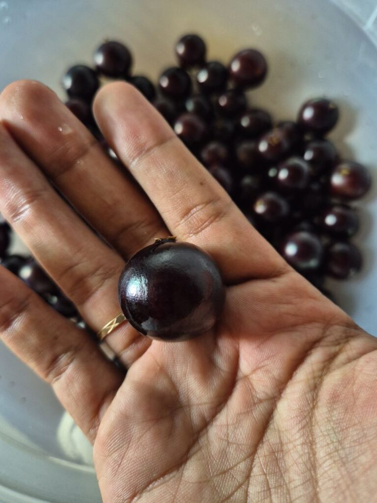 Você conhece a fruta jabuticaba? Ela ocorre na Mata Atlântica. É escura, boa e saborosa. O agrônomo da Universidade Federal do Paraná, Idemir Citadin, acerca dela, diz que (2010, p.1): “[…] é muito apreciada tanto para consumo in natura como para a fabricação de geleia, bebidas fermentadas, vinagre e licores.” E você? Já provou a jatubicaba? Hoje eu comprei esta fruta em minha cidade, e agora irei comê-la. Isso aí.